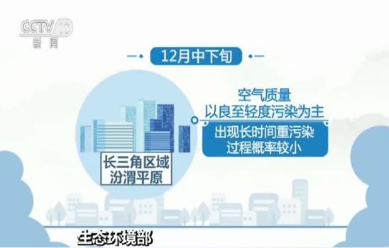 12月中下旬,受冷空气扩散过程影响,长三角区域、汾渭平原空气质量以良至轻度污染为主,出现长时间重污染过程概率较??;东北区域整体空气质量一般,首要污染物为PM2.5;华南区域冷空气活跃,但强度一般,区域北部将出现局部中至重度污染;西南区域、西北区域部分城市可能出现不同程度重污染过程,新疆南疆受大风天气影响将持续出现扬沙或浮尘天气。