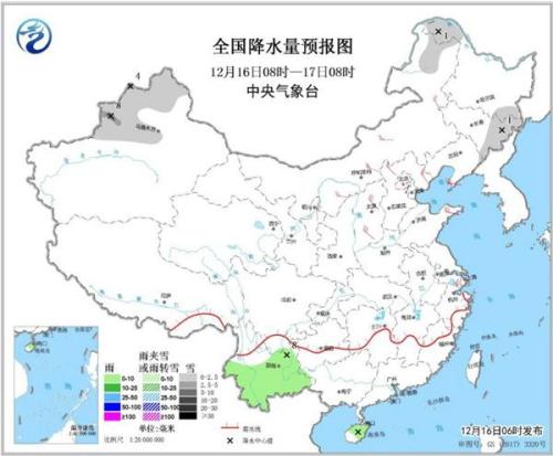 今明天,我国出现雨雪的地方不多,强度也不强。中央气象台预计,今天,新疆北疆北部及沿天山地区、内蒙古东北部、黑龙江西北部和东南部、吉林东部等地部分地区有小到中雪或雨夹雪,其中,新疆伊犁河谷等地局地大雪(5~8毫米)。云南大部、海南岛大部等地部分地区有小雨。