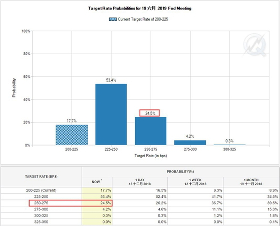 截至北京时间12月19日17时,芝加哥商业交易所“美联储观察工具”显示,2019年1月和3月,美联储维持联邦基金利率2.25%-2.50%不变的概率分别为68.7%和62.2%;2019年6月,美联储加息25个基点的概率仅为24.5%。