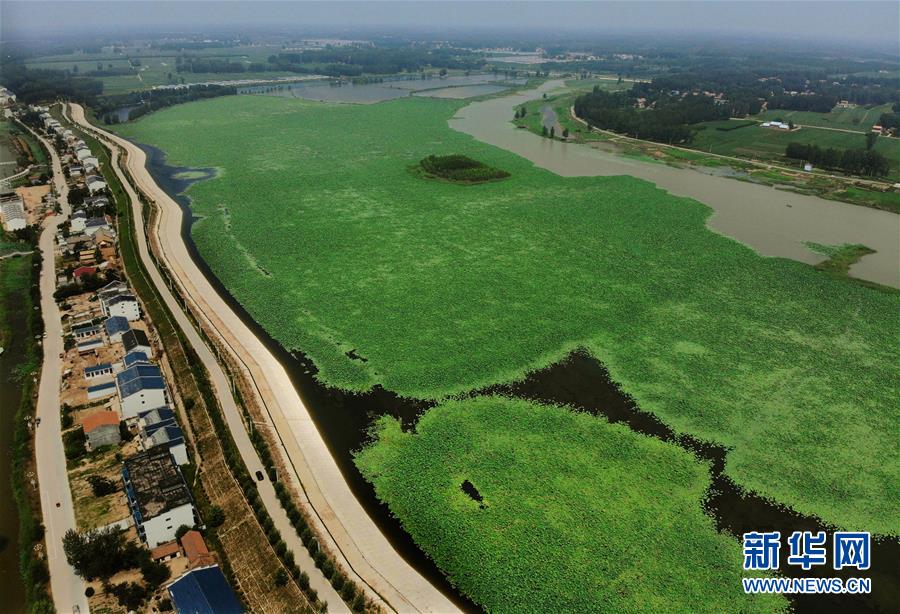 这是河南省民权县任庄村内的荷花生态园(7月7日无人机拍摄)。 新华社记者 李安 摄