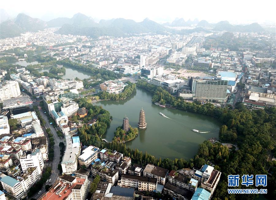 游船在广西桂林市杉湖湖面上穿行(10月17日无人机拍摄)。 新华社记者 周华 摄