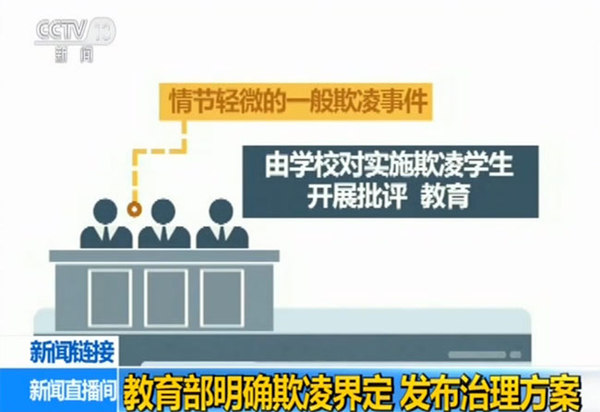 央视网消息:对于校园欺凌事件,此前,教育部也发布了《加强中小学生欺凌综合治理方案》,明确了学生欺凌的界定。