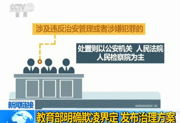 2017年11月,我国教育部等十一个部门联合印发了《加强中小学生欺凌综合治理方案》,明确了学生欺凌的界定,提出了预防的具体举措,规范了处置程序,对学生欺凌的不同情形明确了惩戒措施。根据方案,情节轻微的一般欺凌事件,由学校对实施欺凌学生开展批评、教育;情节比较恶劣、对被欺凌学生身体和心理造成明显伤害的,学校对实施欺凌学生开展批评、教育的同时,可请公安机关参与警示教育或对实施欺凌学生予以训诫。屡教不改或者情节恶劣的,必要时可将实施欺凌的学生转送专门学校进行教育;涉及违反治安管理或者涉嫌犯罪的,处置则以公安机关、人民法院、人民检察院为主。