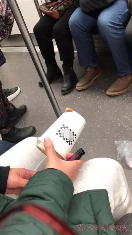 24日上午,市民王女士(化姓)向记者反映,上午她在地铁四号线乘车时,在车厢内看到一女子用打火机点燃手中的奶茶杯。