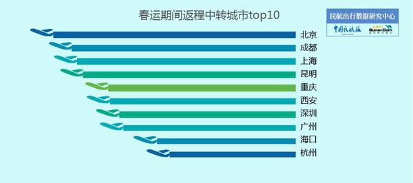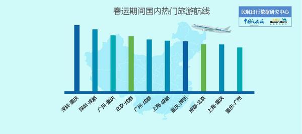 《出行预测报告》显示,从目前的订票情况看,春运期间,以家乡所在地为目的地的乘机人数只占总出行人数的48%,另外52%乘机人到达目的地中,除了出境游之外,根据目的地属性,以国内典型旅游城市为目的地的出行人数增长明显。成都、重庆、广州等地是春节期间国内热门旅游目的地。深圳——重庆、深圳——成都、广州——重庆、北京——成都、广州——成都等多条航线,成为春运期间国内最热门旅游航线。