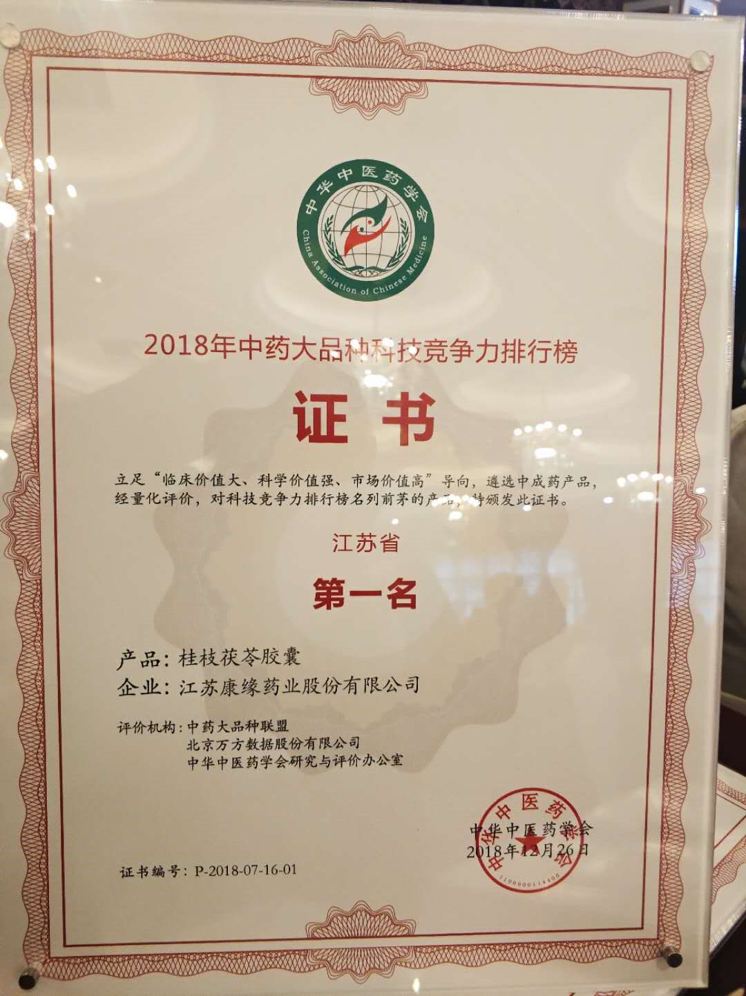江苏康缘药业股份有限公司生产的桂枝茯苓胶囊荣获“2018年中药大品种科技竞争力排行榜”第一名。