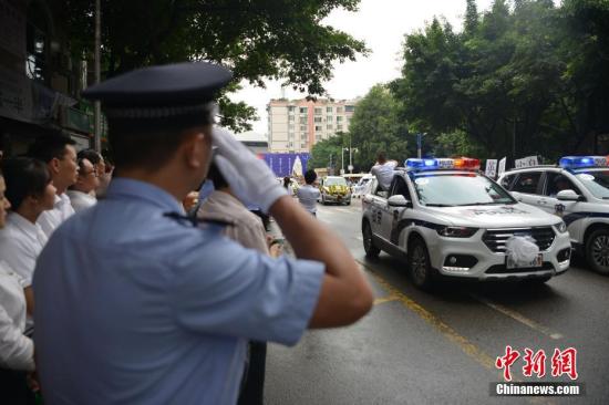资料图:8月6日上午,四川省眉山市仁寿县公安局富加派出所所长王涛、辅警廖弦,为?;と嗣袢褐谏撇踩氤智?、刀的犯罪分子殊死搏斗,身受重伤,经抢救无效因公殉职。 中新社记者 张浪 摄