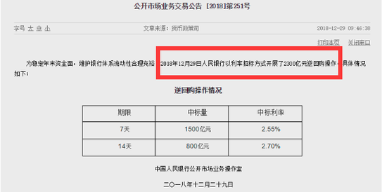 今早,央行网站公告称,为稳定年末资金面,维护银行体系流动性合理充裕,2018年12月29日即今天央行以利率招标方式开展了2300亿元逆回购操作。