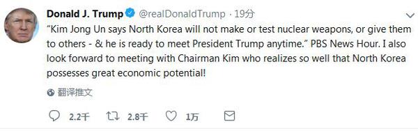 特朗普在社交媒体上表示:“金正恩委员长很清楚地认识到朝鲜拥有巨大的经济潜力,我也期待与他会晤?!?/p>