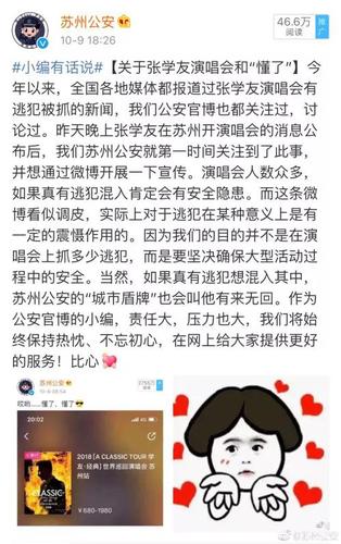 12月28日—30日,张学友演唱会在苏州连演三天。 三天时间,苏州公安在全市范围内共抓获22名在逃人员。当然,这并不是仅仅源于歌神的助攻,也是苏州公安民警日日夜夜守护平安的无私奉献。