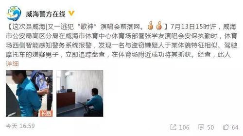 7月13日山东威海演唱会:1人,2016年因涉嫌盗窃被网上追逃。