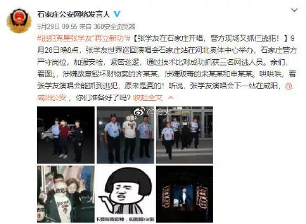 9月28日河北石家庄演唱会:3人,涉嫌故意毁坏财物、贩毒被网上追逃,警方通过技术比对将三人抓获。(此前报道:张学友公开回应“逃犯克星”称号:是我们国家太先进了?。?/p>