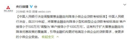 据中国人民银行办公厅官方微博消息,中国人民银行决定,自2019年起,将普惠金融定向降准小型和微型企业贷款考核标准由“单户授信小于500万元”调整为“单户授信小于1000万元”。这有利于扩大普惠金融定向降准优惠政策的覆盖面,引导金融机构更好地满足小微企业的贷款需求,使更多的小微企业受益。