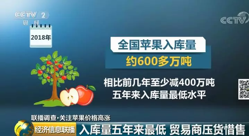 数据显示,2018年全国苹果入库量约为600多万吨。相比前几年的1000万吨左右,至少减了400万吨,这也是五年来入库量最低的水平。库存大幅下降,苹果价格高涨,销量也比往年少了很多。