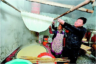 驻韩桥村“第一书记”任少贤(右)来到张忠秀家的豆腐坊,帮助她做豆腐和豆皮。