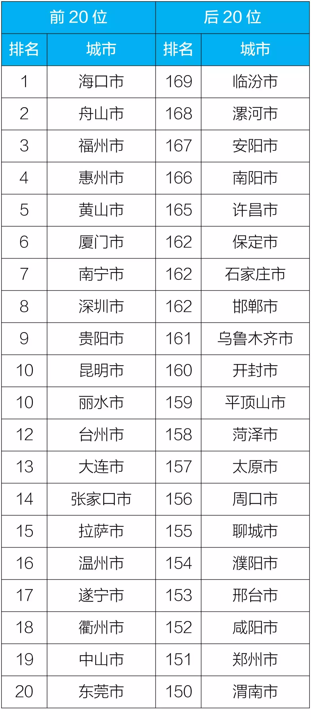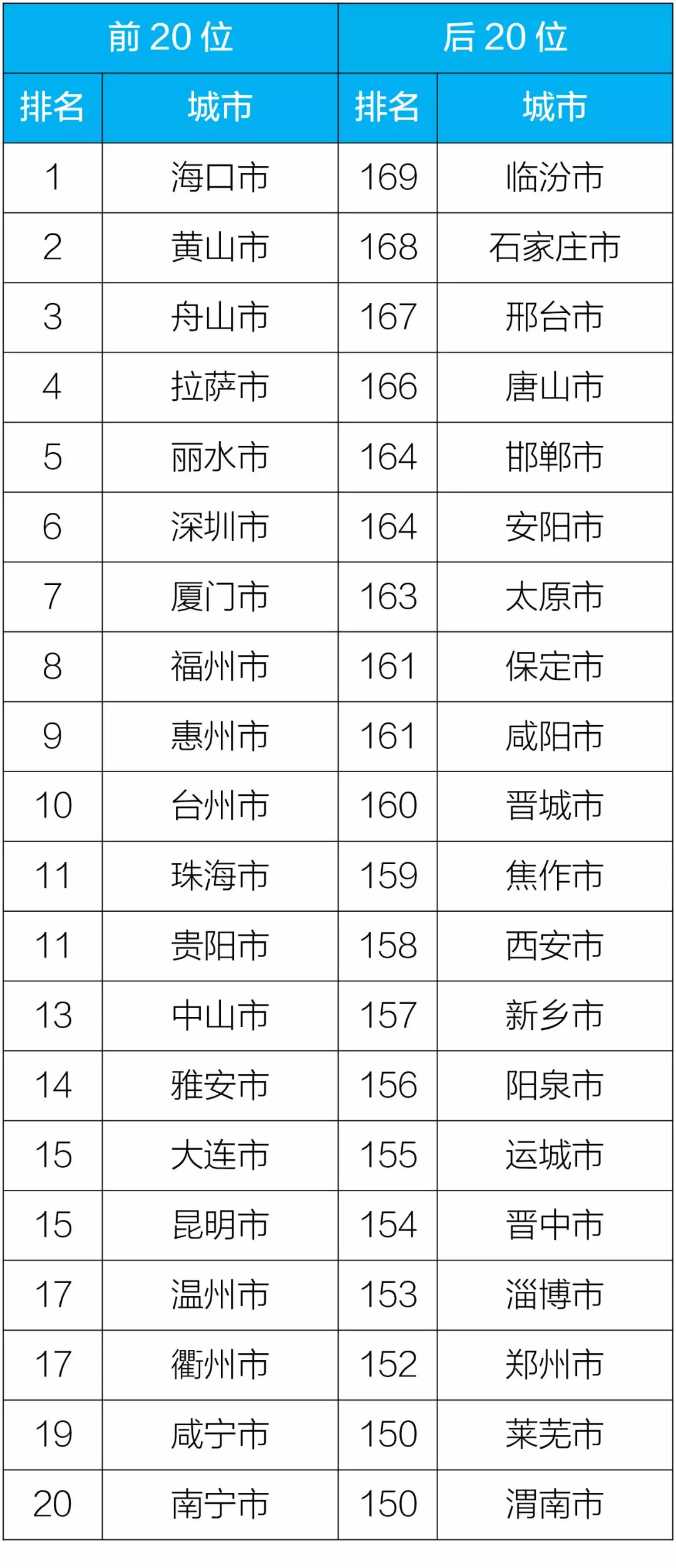 2018年12月169个重点城市排名前20位和后20位城市名单
