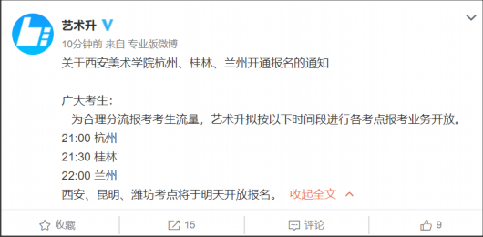 中午12点,艺术升宣布“暂停提供报名服务,进行报名系统架构升级”。下午4点49分,艺术升发文回应“崩?!笔录担?019年艺考政策调整,全国艺术院校减少、考点削减,加上考点容量限制等原因,造成大量考生集中报名院校部分考点的状况。艺术升表示,因报名人数过多等因素造成的报名系统卡顿及暂停维护是临时突发状况,会尽快疏通报名通道。此外,对于“有内幕”“艺术升可以私下报名”的传言,艺术升回应说,所有院??际员肟诰骋豢牛牍愦罂忌凹页の鹨蛲系牟皇笛月鄱只?。艺术升还说,此事造成的影响较大,当前教育厅信息主管部门、公安网监部门均密切关注事件进展。下文注意到,6日晚8点07分,艺术升官方微博宣布西安美术学院杭州、桂林、兰州考点于9点开始相继恢复报名。值得注意的是,不少网友质疑艺术升作为第三方工具为何会具备艺考报名的资质。