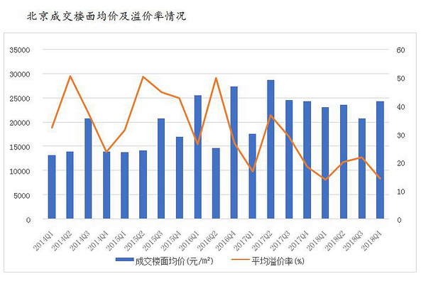 诸葛找房称,从北京土地历史成交的楼面均价及溢价率来看,土地成交楼面价从2016年以来开始走高,2017年达到高峰,2018年土地成交楼面价维持在高位。而从溢价率来看,北京土地成交溢价率从2016年开始持续波动下滑,2018年土地成交溢价率同比2017年继续下跌43%,为近5年最低,年内平均溢价率仅为13.72%。
