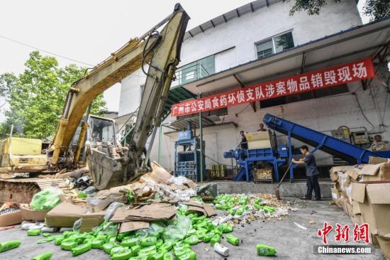 资料图:工作人员销毁假冒伪劣食品药品。中新社记者 陈骥旻 摄
