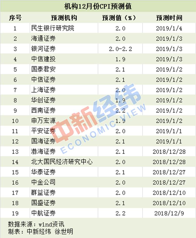 Wind资讯数据显示,19家机构对12月CPI进行预测,预测平均值为2.0%。其中,仅3家机构认为12月CPI可能回落至“1时代”,多数机构认为12月CPI仍将处于“2时代”。