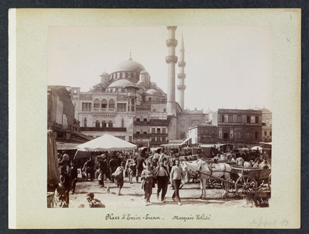 伊斯坦布尔的艾敏厄努广?。‥min?nü)集市和耶尼清真寺(Yeni Cami, 新清真寺),商店标志上有奥斯曼土耳其语、亚美尼亚语、希腊语和法语,1884-1900,Sébah&Joaillier摄。来自Pierre de Gigord Collection中的奥斯曼帝国和土耳其共和国图片集。盖蒂研究所。
