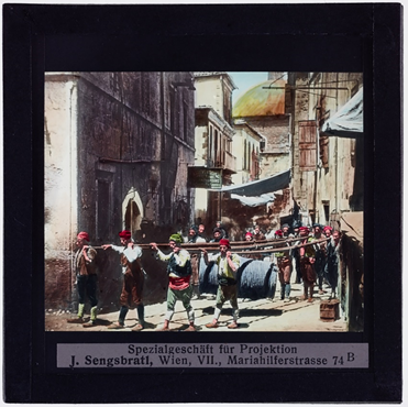 搬运工搬运绳索,Josef Sengsbratl摄。手工彩色玻璃灯笼幻灯片。来自Pierre de Gigord Collection中的奥斯曼帝国和土耳其共和国图片集。盖蒂研究所。
