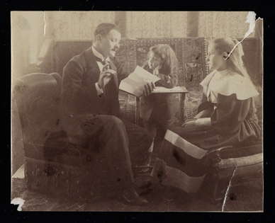 男人为两个女孩读信,1890年,摄影师不详。来自Pierre de Gigord Collection中的奥斯曼帝国和土耳其共和国图片集。盖蒂研究所。