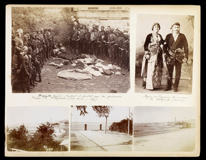 从左上方顺时针方向:库尔德匪徒被土耳其宪兵捕获并执行死刑、黑海沿岸城市特拉布宗、一对来自特拉布宗的夫妇、港口和有轨电车,1885-1995,摄影师不详。盖蒂研究所。