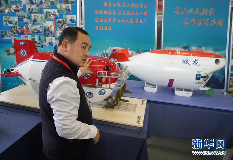 在中船重工第七〇二研究所,叶聪在“蛟龙号”“深海勇士”号模型前介绍情况(2018年12月24日摄)。