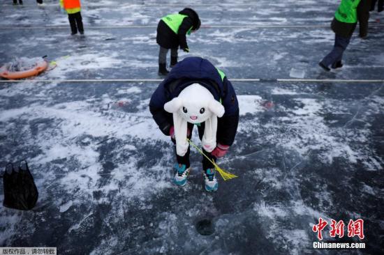 图为游人在观察钓鳟鱼的冰洞。