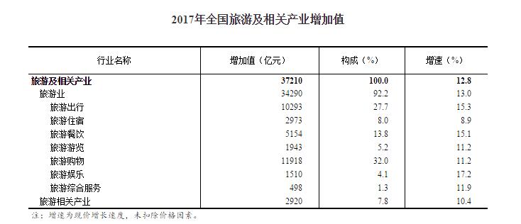 经核算,2017年全国旅游及相关产业增加值为37210亿元,比上年增长12.8%(未扣除价格因素,下同),比同期GDP现价增速高1.9个百分点,占GDP的比重为4.53%,比上年提高0.08个百分点。从分行业数据来看,旅游出行服务、旅游餐饮服务、旅游娱乐服务增长较快,增加值增速分别为15.3%、15.1%和17.2%。