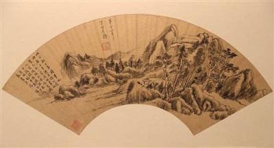 是图布局较为繁密,具体而微。皴法柔和,山石造型圆浑,明显源自黄公望画法。据画左程嘉燧题跋可知,此扇页系董氏三十五岁时作品,此作可以认定为目前传世董其昌最早绘画作品,对于研究其早期画风具有重要意义,十分珍贵。 《山居图扇页》 金笺水墨 董其昌(明) 上海博物馆藏