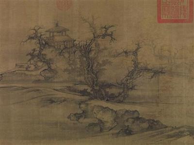 郭熙是北宋宫廷山水画传统的领军人物之一,侧重表现耸立的高峰,但他以广阔平原为视角的小品山水绘画亦深入人心。此幅《树色平远图卷》是其流传下来的山水佳作,充分表现了郭熙的私人寄情,氤氲薄雾和云样山石,想要传达的是一种淡淡的愁绪,而非恢宏的气势。 《树色平远图卷》局部 绢本水墨 郭熙(北宋) 美国大都会艺术博物馆藏