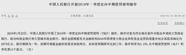 中新经纬客户端1月23日电 据央行网站消息,23日,央行开展2019年一季度定向中期借贷便利(TMLF)操作,操作对象为符合相关条件并提出申请的大型商业银行、股份制商业银行和大型城市商业银行,金额确定为2575亿元,期限为一年,到期可根据金融机构需求续做两次,实际使用期限可达到三年;利率为3.15%,比中期借贷便利(MLF)利率优惠15个基点。