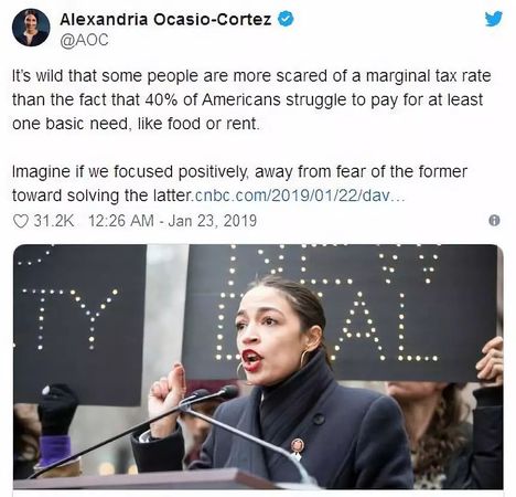 近日,纽约民主党众议员寇蒂兹(Alexandria Ocasio-Cortez)对年收入1000万美元以上富人征收70%税率的提议,引发舆论关注,也引起了达沃斯论坛的精英金融家们的担心。
