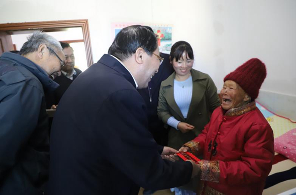 丛斌一行在威宁县迆那镇、斗古镇,旺苍县白水镇敬老院看望慰问了98位孤寡老人,实地查看敬老院的住宿、医务、厨房、公共活动场所等设施,详细了解了敬老院工作开展及老人们的生活情况,向老人们送去九三学社的亲切问候和新春祝福,并逐一发放慰问金。勉励当地干部切实做好养老助残工作,让老人们吃饱、穿暖,过一个欢乐祥和的春节。