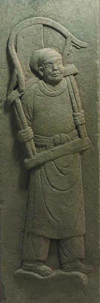 四川地区出土的宋代石室墓石刻精品,常辅以武士、四神、侍者、妇人启门等,展现墓主人日常安逸的生活,可谓享受有侍者,安全有神兽、武士;表现手法采用浮雕的形式,雕工精细,人物形象栩栩如生,如武士像,多结合局部阴线刻法,用刚劲粗犷的笔调,略带夸张的细部描绘,表现武士的孔武有力,凛然难犯。尤妙者,武士或正立或侧立、背立,形态动作、面部表情各异其趣,而脚踏之祥云、飘飞之帛带,使整个浮雕更增静中有动之感。