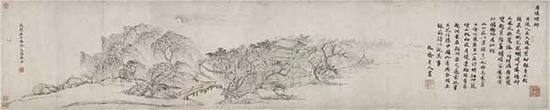 图5 柳如是 月堤烟柳图 卷 纸本设色 纵25.1厘米 横125厘米 1643年 故宫博物院