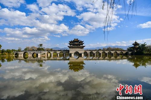 资料图:云南建水,双龙桥在蓝天白云的映衬下引人注目。中新社记者 任东 摄