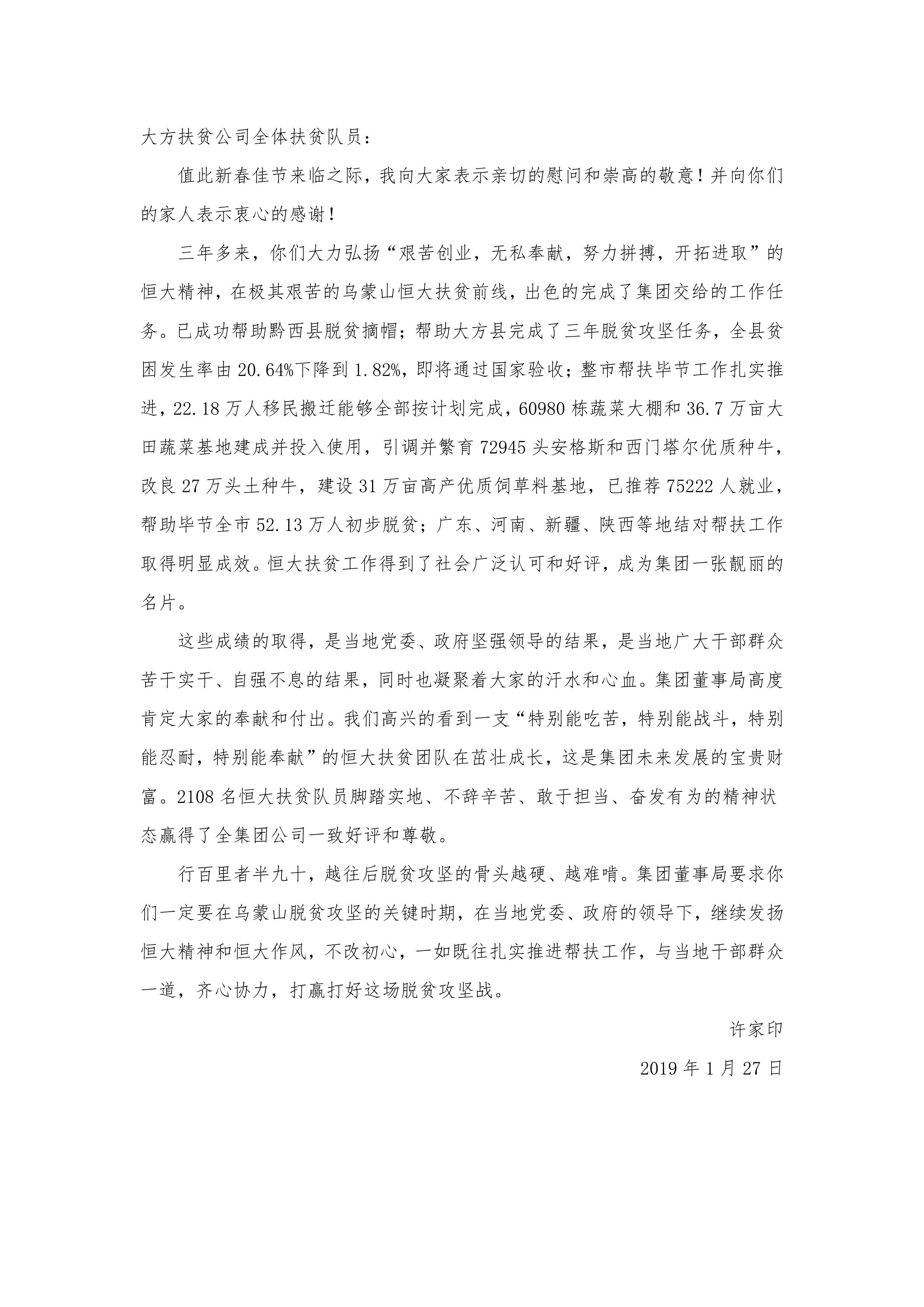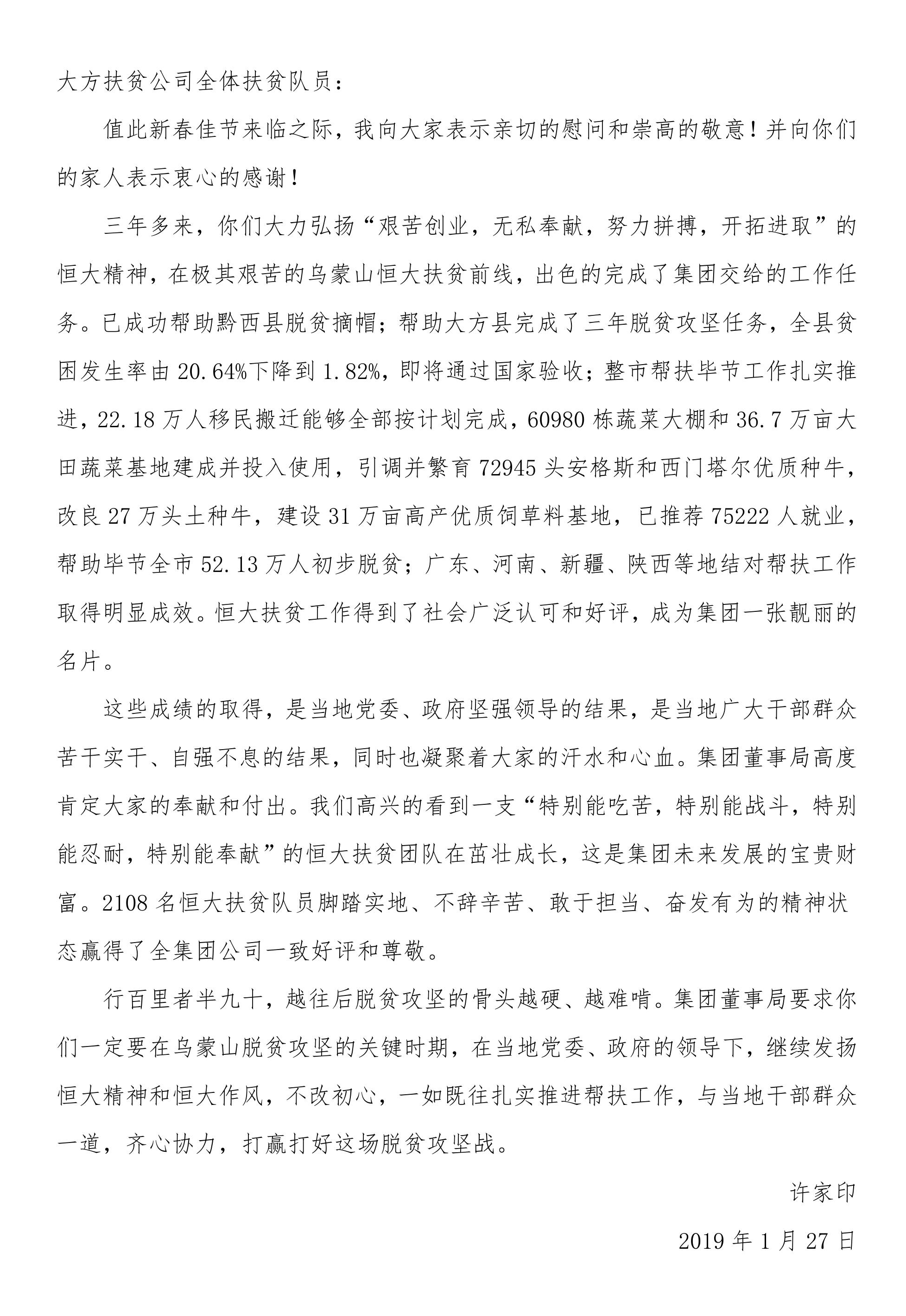 记者看到,这封慰问信是许家印1月27日写给恒大大方扶贫公司全体扶贫队员的。在信中,许家印充分肯定了扶贫队员们的奉献和付出,表示恒大扶贫队员三年多来弘扬“艰苦创业,无私奉献,努力拼搏,开拓进取”的恒大精神,在极其艰苦的乌蒙山恒大扶贫前线,出色完成了集团交给的工作任务,“恒大扶贫工作得到了社会广泛认可和好评,成为集团一张靓丽的名片?!?/p>