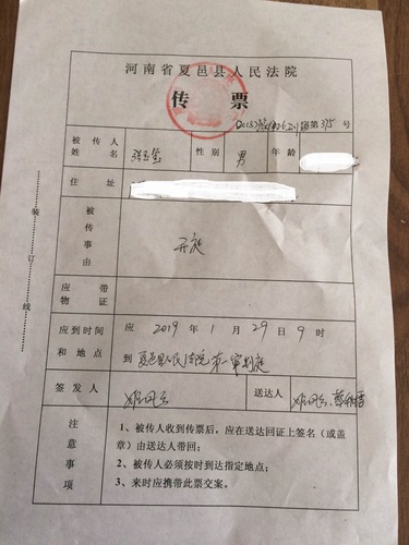 1月26日,张玉玺拿到了夏邑法院开庭通知。受访者供图
