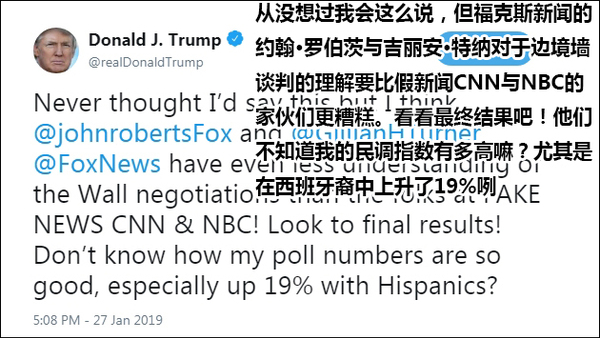 原标题:特朗普点名批评福克斯记者:对建墙谈判的理解比假新闻CNN还糟