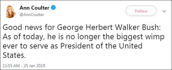 保守主义专栏作家安·寇特(Ann Coulter)周五在推特上表示,“老布什不再是美国总统中有史以来最大的懦夫(wimp)”,暗指特朗普已经取代了他的位置。