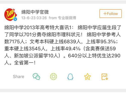 2013年绵阳中学官微发布高考喜讯,段了了以701分获得绵阳市理科高考状元。