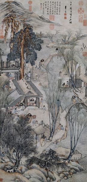 “岁朝”是古时对新年的一种称呼,有关岁朝的民俗活动非常丰富,李士达的这幅《岁朝村庆图》就真实的反映了晚明时期民间庆祝新年的种种活动。图中画一处山村,人们有的外出拜年访友,有的燃放爆竹,有的聚在室内赏画,热闹非凡??梢钥吹接械氖夷诠易胖迂富?。李士达笔下的人物线条流畅,轮廓浑圆,造型极富特色,所画树木略带变形,带有一定的装饰意味。
