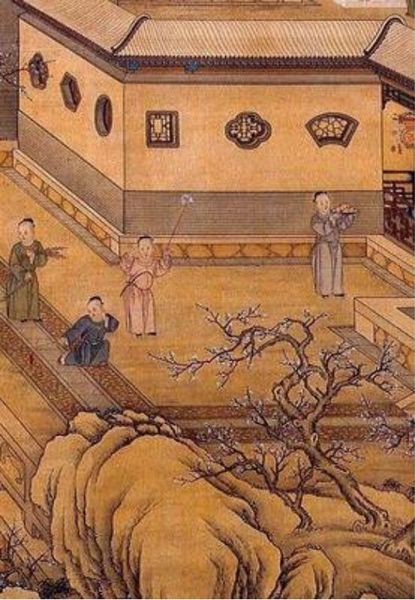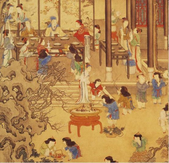 此图描绘过年阖家欢庆团圆的场面。男女主人端坐厅堂,孩童们则敲锣击鼓、吹笙拍板,耍玩傀儡、点燃炮竹,嬉戏于庭院中。家仆或持酒壶侍立,或端送糕果,穿梭于前厅回廊里。后院妇女忙碌准备年夜饭,远处阁楼上男仆合力悬挂大灯笼。庭院火盆烧着松枝、芝麻秸,室内布置着“四季花卉”大立屏,朱几瓶插牡丹,烘托出满堂富贵吉祥的年味。