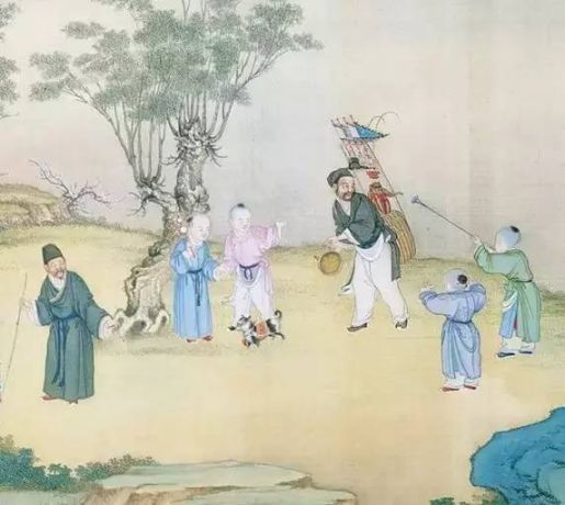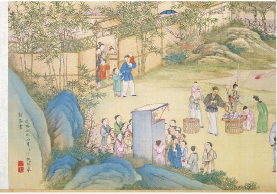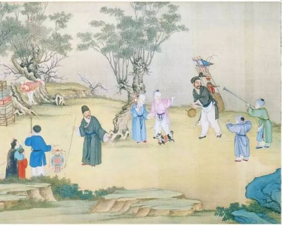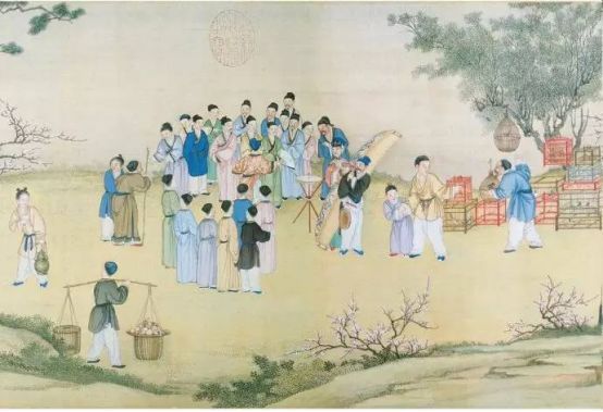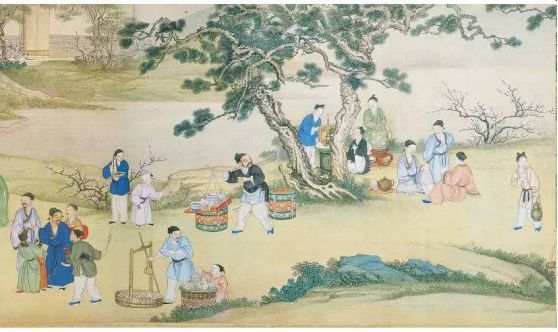 此卷描绘新春农村热闹欢庆春节情景,爆竹、太平鼓、果品、鸟鱼挑摊,以及各种行业的耍猴货郎、算命、跑旱船、演傀儡戏的表演艺人。松树下文士品茶闲聊,朱漆托盘内置有紫砂大壶与青花碗,装泉水则用绿地花卉大壶、茶铫。挑夫担子盛放糕点使用的是青花与描红龙纹碗、盘,均是乾隆时期宫廷用器,可知街上买卖艺人都是由宫中侍仆所装扮。