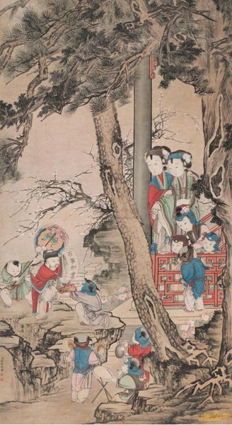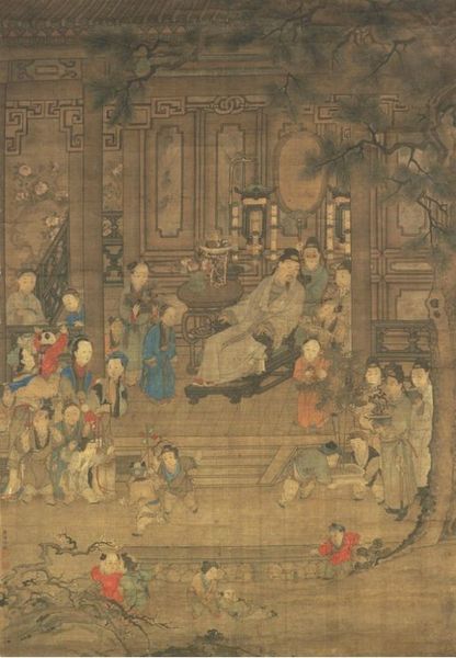画中描绘的是一大户家族在新春之际于庭院中欢庆的场景,人物众多,画中前上方坐椅上的人为主人公,僮仆妇孺、童婴围绕其间,一派欢庆喜象。孩童们在端羊盆景、玩着游戏、放着鞭炮?;叶匀宋锷裉袒胛⑸?,设色也颇丰典雅。