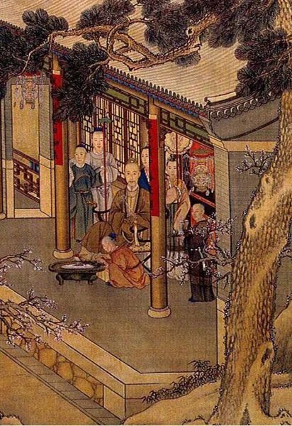 这幅作品中绘乾隆皇帝与皇族子弟在庭院内点炮竹,庆贺岁朝的热闹场景。其慈祥的目光,温柔的举止,显现出他身为帝王之外,作为普通家长的一面,令画面充满无限的爱意与温情。