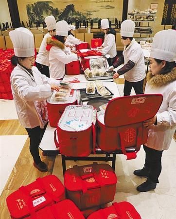 2月3日,苏州一家老字号餐馆服务员为“打包年夜饭”套餐配菜。杭兴微摄(新华社发)